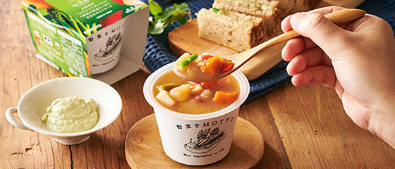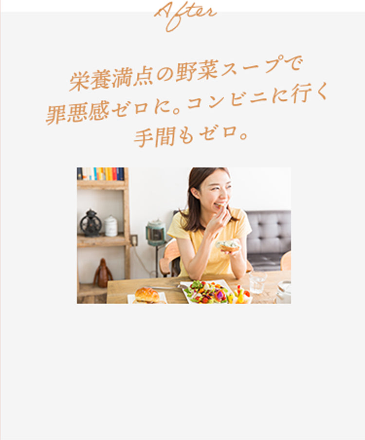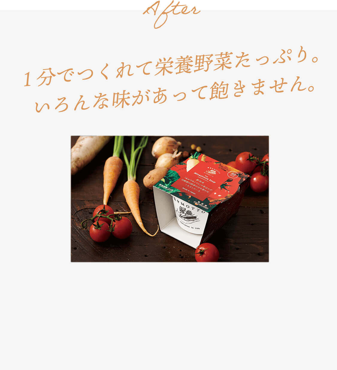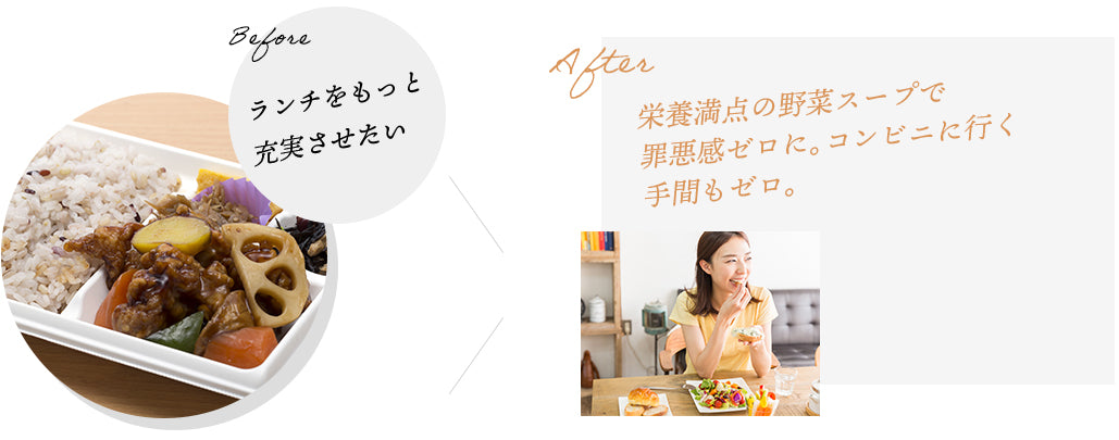 お昼休憩の限られた時間をもっと充実させるために。野菜たっぷりのスープで罪悪感はほぼゼロに。コンビニで並ぶ時間も節約できます。